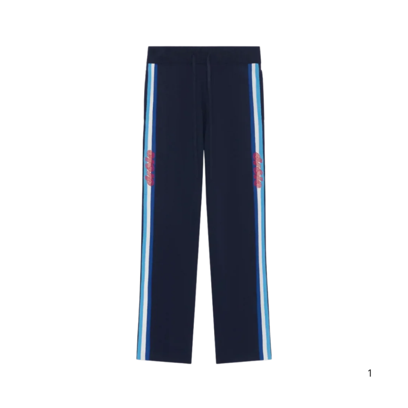 Ce pantalon en maille bleu marine revisite l’esthétique sportswear avec élégance. Il est doté de bandes contrastantes bleu ciel et bleu clair sur les côtés, soulignées du logo Drôle brodé en rouge, qui apportent une touche graphique rétro. Sa coupe droite et fluide offre confort et liberté de mouvement, idéale pour un look décontracté mais affirmé.