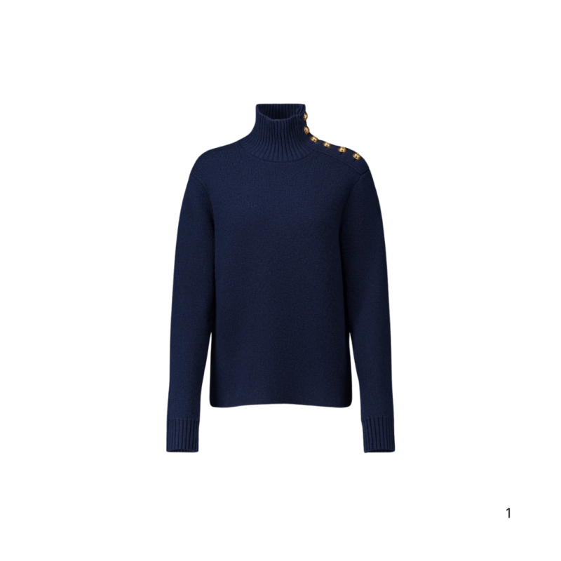 Le pull Maillon de Laurence Bras combine élégance et confort dans une maille chaude et raffinée. Sa coupe droite est sublimée par un col montant à côtes et une ligne de boutons dorés sur l’épaule, détail signature qui lui confère une allure chic et sophistiquée. Sa couleur bleu marine en fait une pièce intemporelle, facile à associer aussi bien avec un jean casual qu’une jupe habillée.