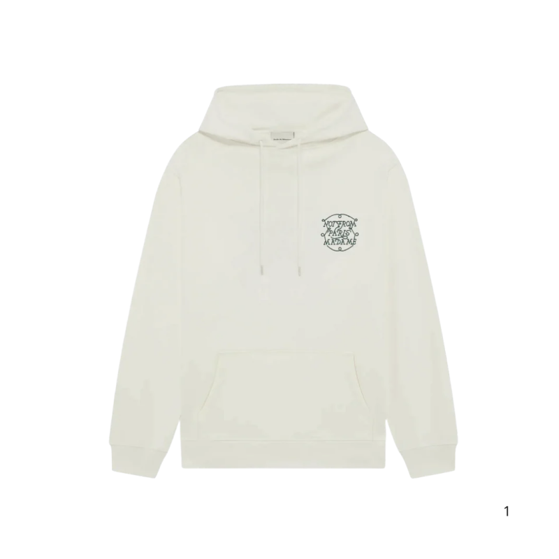 Ce hoodie Drôle de Monsieur en coton écru arbore le célèbre slogan "Not From Paris Madame", revisité dans une broderie effet tressé sur la poitrine. Son design épuré est complété par une capuche à cordons, une poche kangourou pratique et des finitions côtelées pour un confort optimal.