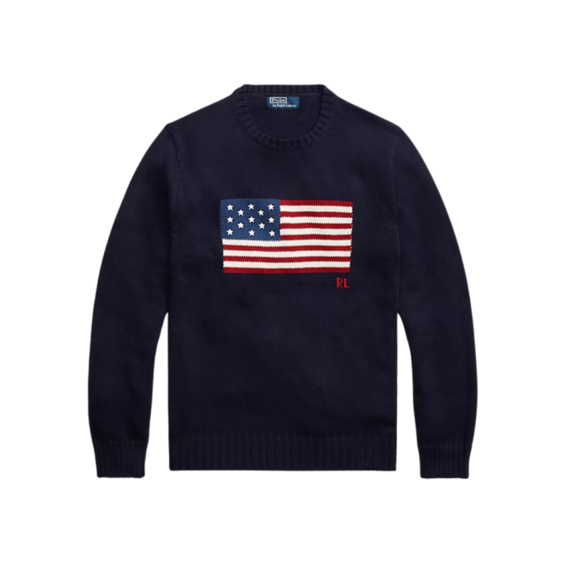 Pull en maille douce, arborant le drapeau Ralph Lauren sur la poitrine. Coupe classique, col rond, style sobre mais emblématique — idéal pour un look soigné et décontracté.