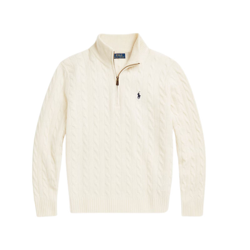 Pull torsadé en laine et cachemire avec col camionneur zippé. Coupe élégante, motif torsadé raffiné, poignets et ourlet côtelés — une pièce chic et versatile, parfaite pour un look habillé mais confortable.
