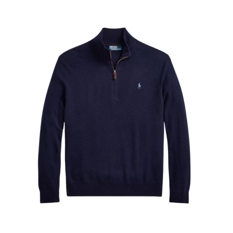 Allie élégance et confort avec ce pull demi-zippé en laine 100 %. Doté d’un col cheminée côtelé avec zip à la base, il permet de moduler l’allure selon l’humeur : col remonté pour une touche sophistiquée, ouvert pour un style plus casual. On retrouve le cavalier brodé sur la poitrine, discrètement emblématique. Coupe droite, finitions côtelées aux poignets et à l’ourlet.