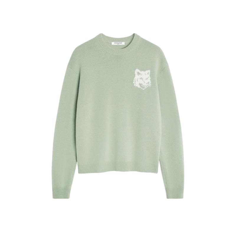 Pull en laine mérinos Maison Kitsuné, doux et chaud, avec coupe droite et finitions côtelées. Il se distingue par une tête de renard en intarsia contrastée sur la poitrine. Un essentiel chic et confortable, parfait pour la mi-saison ou l’hiver.