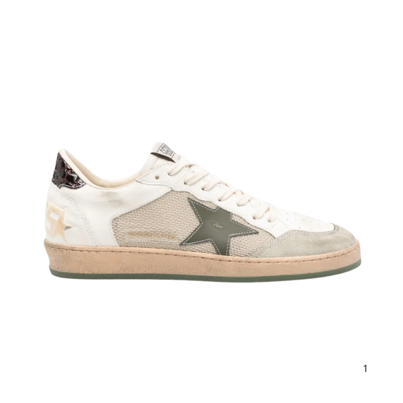 Les Golden Goose Ballstar s’inspirent des modèles vintage de basketball pour un look résolument cool et rétro. Confectionnées en cuir et mesh blanc avec l’étoile kaki emblématique, elles affichent un style usé unique propre à la marque. Leur semelle légèrement vieillie et leurs détails raffinés apportent une touche sportive et tendance.