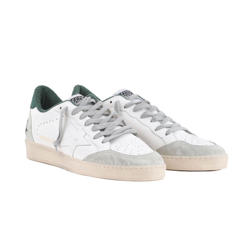 Baskets basses avec étoile en cuir blanc ton sur ton, renfort talon en cuir lisse vert, et lacets gris. Talon et pointe en cuir suédé gris, avec des effets usés.