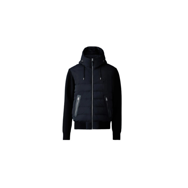 La veste ANDREW, matelassée en duvet léger avec capuche intégrée, combine une coupe régulière et un style hybride avec des manches, un dos et une ceinture en tricot doux. Ses poches zippées à la taille sont pratiques, et le logo M sur la poitrine apporte une touche unique. Idéale pour un usage quotidien.