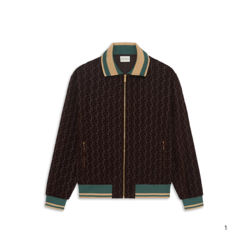 Cette veste zippée Drôle de Monsieur combine esprit rétro et élégance contemporaine. Elle se distingue par son all-over monogramme “D” sur fond brun, associé à des finitions en maille côtelée contrastée vert et beige au col, aux poignets et à la taille. Son zip doré et ses poches latérales zippées apportent une touche pratique et raffinée.