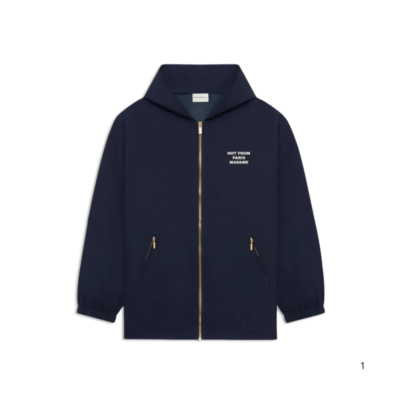 Cette veste légère à capuche arbore le célèbre slogan "Not From Paris Madame" imprimé à l’avant et en grand format au dos. Confectionnée dans une teinte bleu marine, elle est dotée d’une fermeture zippée dorée et de poches zippées pratiques. Sa coupe décontractée et son style minimaliste en font une pièce polyvalente, parfaite pour compléter un look streetwear chic.